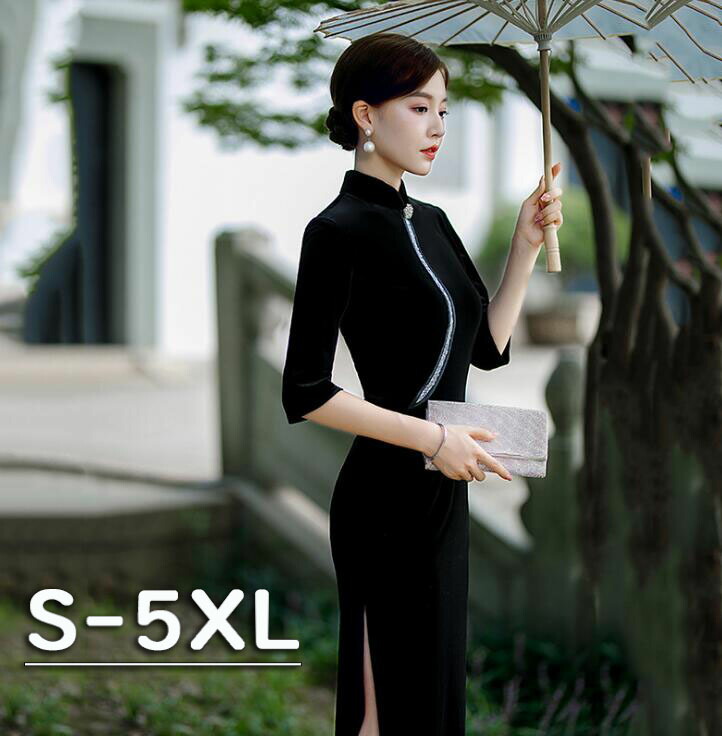 黒 チャイナドレス 高級 ロング丈 半袖チャイナドレス スリット入り マキシ丈 マーメイド 細身ドレス 上品 コスチューム 忘年会 謝恩会 演奏会 大きいサイズ 中華服 ベロ コスプレ