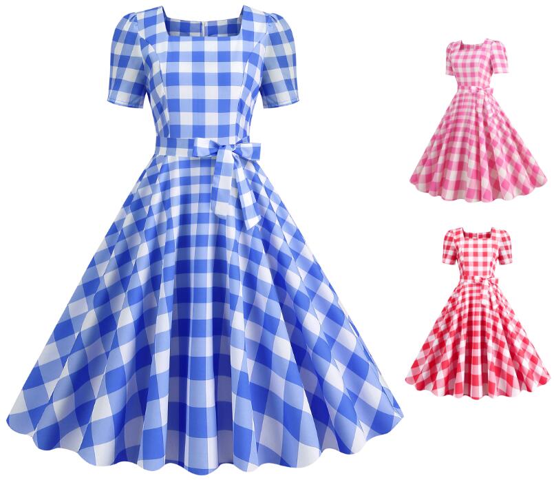 半袖 レトロドレス 女性ダンス衣装 大人 大きい裾ワンピース チェック柄 膝丈ドレス レトロワンピース 細身 フレアドレス ステージお揃い 演出服 可愛い 舞台ダンス衣装 3色 イベント衣装