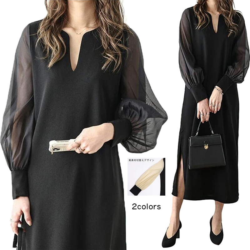 ワンピース レディース 春 夏 長袖 シフォンスリーブ 透け感 シアー スリットネック ゆったり 着痩せ カジュアル 薄手デザインドレ 体型カバー