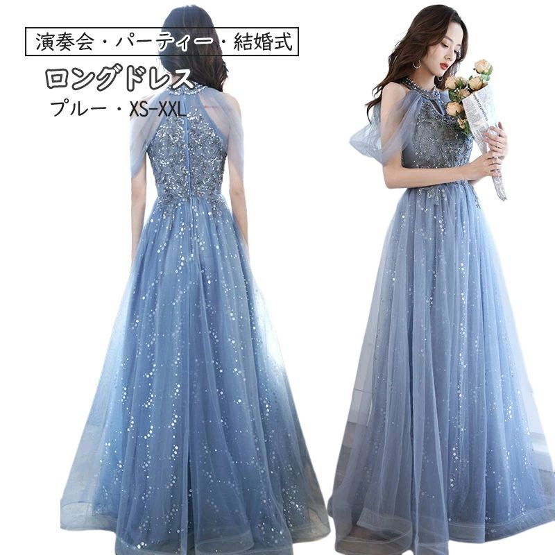 ドレス ロングドレスワンピース レース結婚式 演奏会パーティー発表会ピアノ 二次会 披露宴 膝下成人式 ブルー XS-XXL 上品