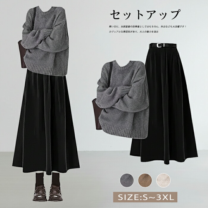 【レビュー特典】ニットアップ コーデセット 上下セット スカート フレアスカート マキシスカート オーバーサイズニット 韓国コーデ ファッション 大きいサイズ 秋冬コーデ シンプル