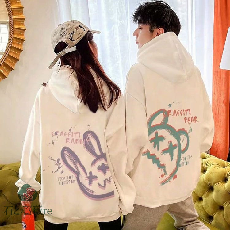 ペア カップル ペアルック パーカー プリント 熊 兎 黒 白 秋冬春 ペアお揃い 派手 レディース メンズ ファション 写真撮り プレゼント おしゃれ 日常 彼女 記念日 お祝い 韓 彼氏
