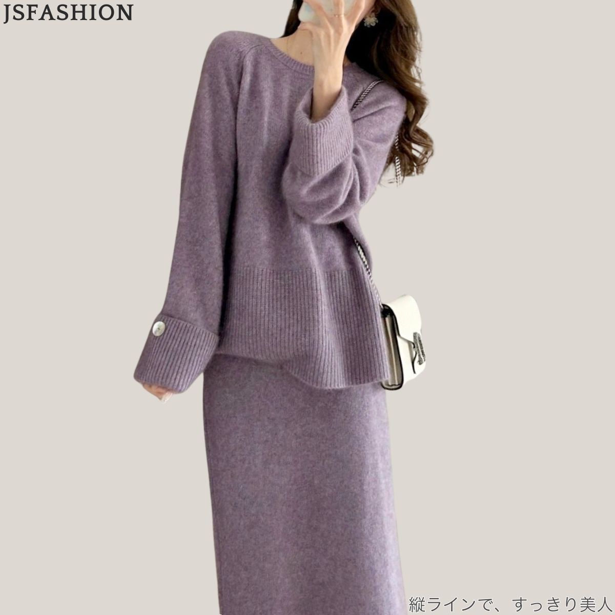 ニットセットアップ レディース 2点セット ロングスカート ニットアップ 長袖 プルオーバー 紫 パープル 体型カバー きれいめ 春 秋 冬 大人カジュアル