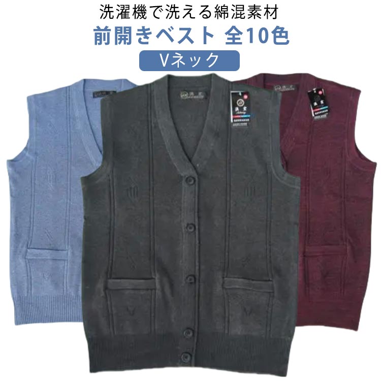 前開き ニット ベスト 洗える シニアファッション 90代 70代 80代 60代 春夏 秋冬 メンズ 大きいサイズ Vネック ポッケト付き ボタン 綿混 コットン混 暖かい あったか 無地 シ 防寒