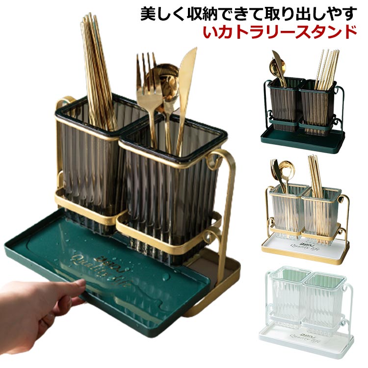 キッチン 小物 箸立て 水受け皿付き 水切り 北欧 コーティング塗装 箸ラック 箸入れ カトラリーケー フォーク 自立式 収納 カトラリー収納 ラック 卓上 半透明 クリア カトラリ ダブル