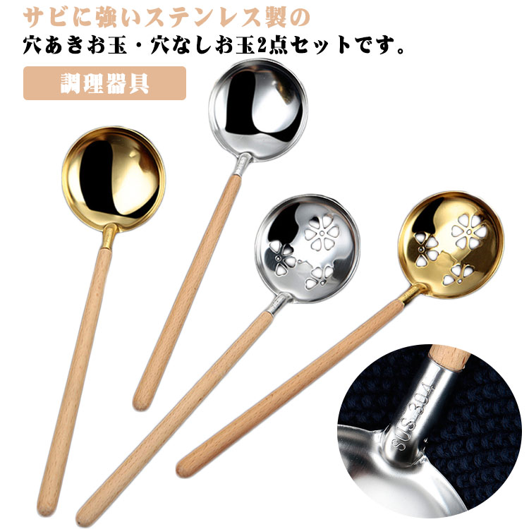 お玉 ステンレス製 天然木ハンドル 穴あき 穴なし 2点セット おたま お玉 キッチンツール 台所用品