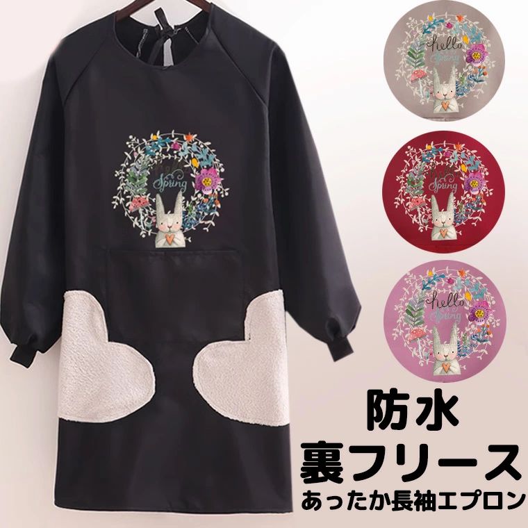 防水 裏起毛で真冬もあったか 裏フリース ウサギ 長袖エプロン