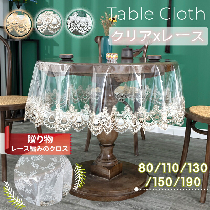 テーブルクロス テーブルマット ビニール 透明 円形 北欧風 薄手 テーブルカバー クリア 撥水 レース付き 刺繍花柄 80 90cm 130cm 150cm 180cm 水拭き おしゃれ デコ 防汚