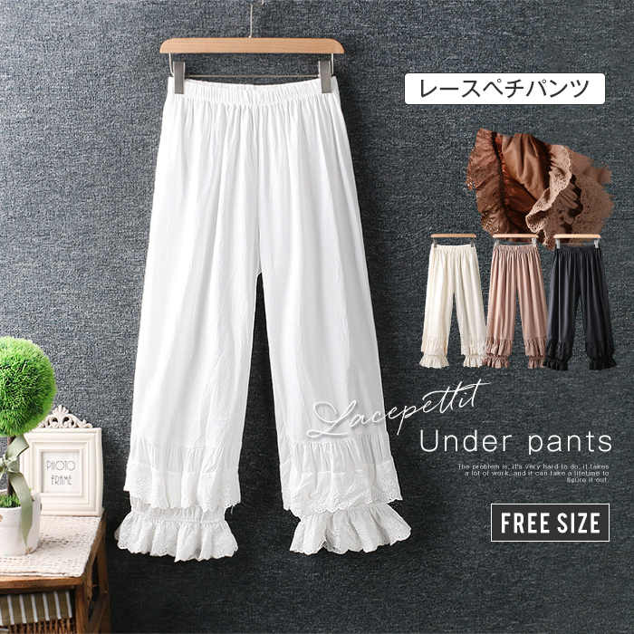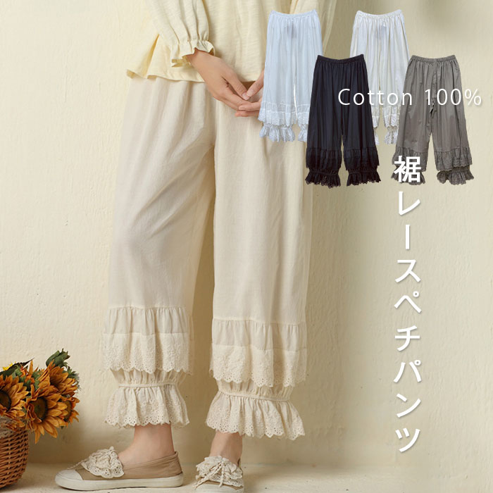 ペチパンツ レース 刺繍 ロング パンツ インナー 透け 防止 レディース ナチュラル 裾ゴム ゆったり 大きめ 楽 涼しい 春 夏 秋 かわいい おしゃれ シンプル カジュアル 重ね着 大人可愛い