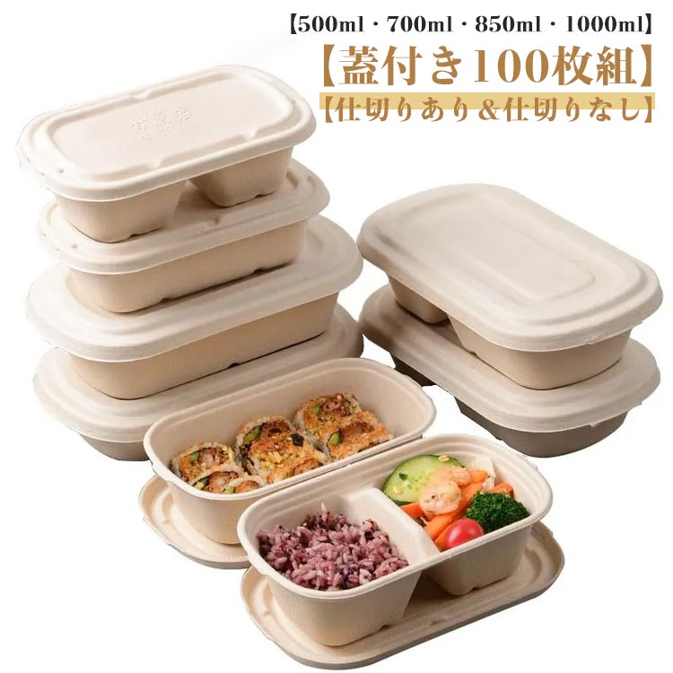 テイクアウト 容器 バガス容器 使い捨て 弁当箱 弁当容器 100枚組 蓋付き 仕切り レンジ対応 紙 業務用 エコ ランチボックス