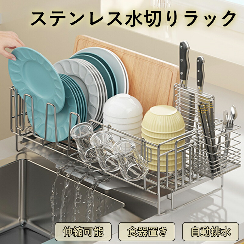 水切りラック 伸縮 折りたたみ ステンレス シンク上 食器 プレート おしゃれ 包丁立て 箸立て コップ立て付き 抗菌 収納 取り外し可能 省スペース 水切りキッチン用品 頑丈 自炊 ワイド 大容量