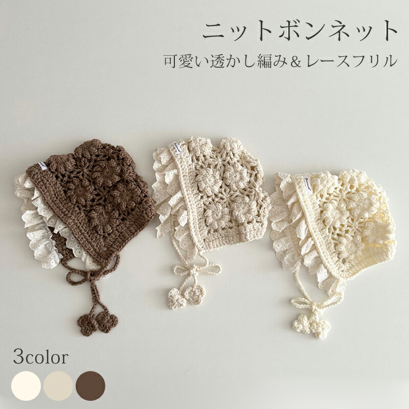 【新着!】透かし編みがとってもオシャレなニットボンネット 退院着に合わせる!ニット帽 ベビー帽子 可愛い レース フリル アウター キッズ 女の子 男の子 子供 ニットキャップ