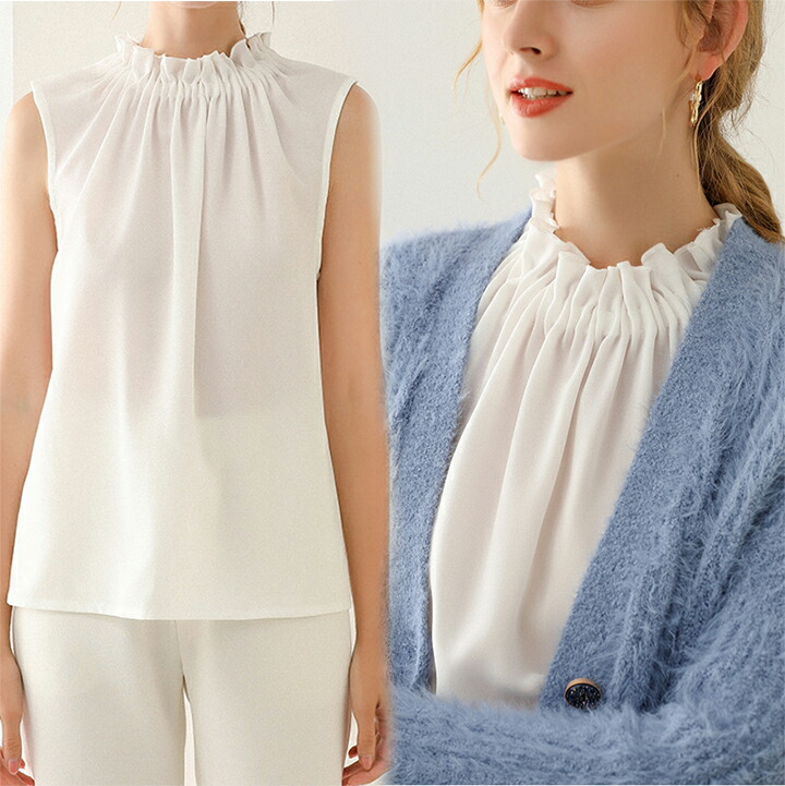 シャーリング襟ノースリーブブラウス インナートップス レース 重ね着風 つけえり 透け 立て襟 おしゃれ チュール 可愛い フェイク襟 スタンドカラー 重ね着 偽襟 衿 インナー襟