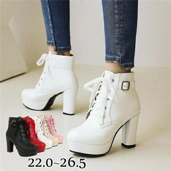 チャンキーヒール ショートブーツ レディース 可愛い おしゃれ 日常 美脚 ヒール レッド ホワイト ブラック ベージュ 小さいサイズ ピンク