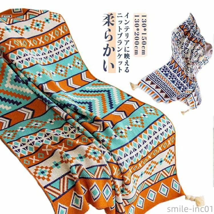 おしゃ 北欧 毛布 お昼寝 フリンジ付きニットブランケット ブランケット 総柄 大判ブランケット エスニック風