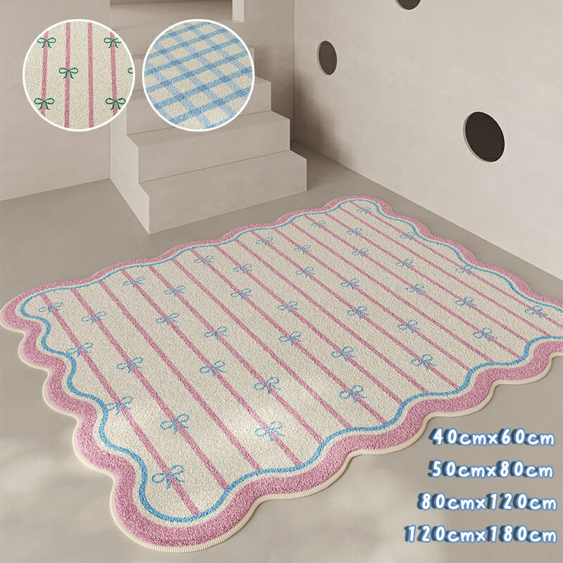 リボン柄&チェックの可愛いウェーブ型ラグ! 滑り止め・洗える・防ダニで便利! 冷暖房対応で一年中使える?防音効果で快適空間に!