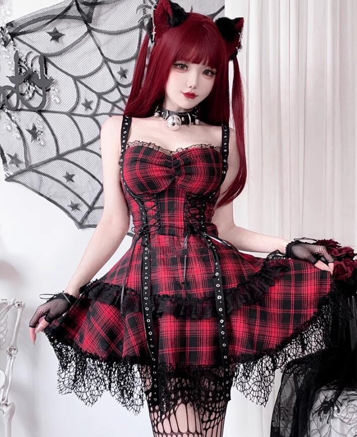 ゴシック ロリータドレス キャミソール チェック柄ドレス ゴスロリ レース 暗黒風 ドレス コスプレ衣装 学園祭 イベント コスチューム レッド 文化祭