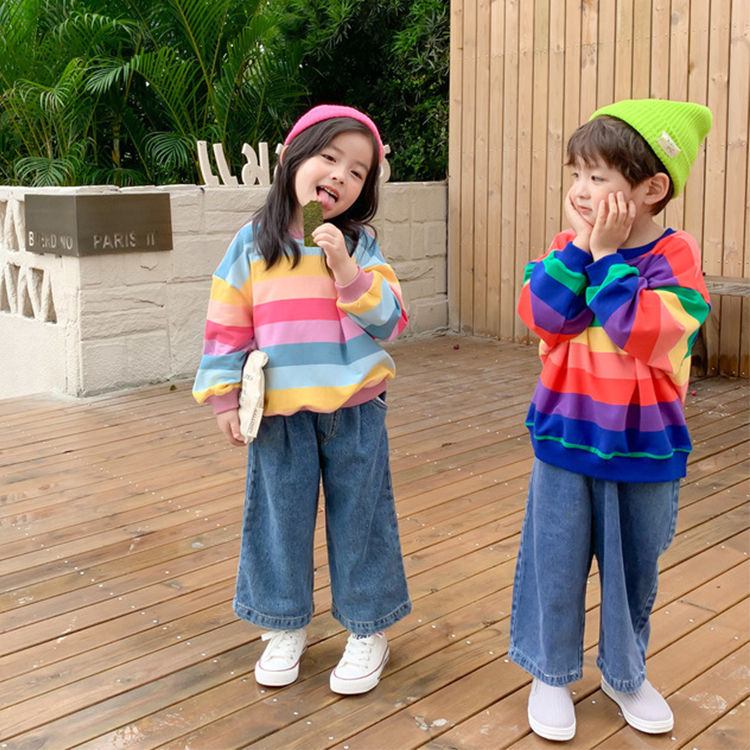 韓国子供服 オシャレ トレーナー スウェット 秋新作 子供服 ベビー 長袖シャツ クルーネック 男の子 女の子 虹色 ボーダー柄 長袖 男女兼用 カジュアル キッズ パーカー スポーツ お出 ジュニア