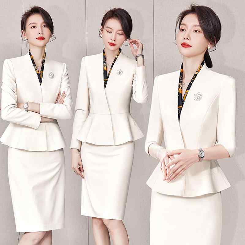 レディース スーツ セットアップ ビジネス 春夏秋 ハイエンド ホテル フロント ジュエリーショップ 美容室 受付 作業着 仕事 ホワイト アイボリー 制服