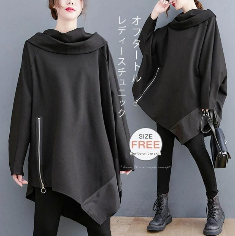タートルネック ゆったり 大きいサイズ 冬 秋 ワンピース 無地 大人可愛い チュニック アシンメトリー 春 長袖 ナチュラル Tシャツ 体型カバー プルオーバー カットソー チュニックワンピース