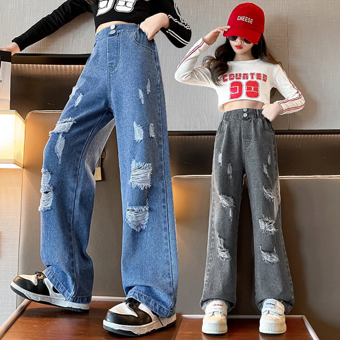 春秋着 女の子 デニムパンツ 子供服 ジーンズ ボトムス キッズ ダンス HIPHOP おしゃれ 子ども服 ダメージ 学生 デニム ロングパンツ ブラック ブルー ストレートパンツ 演出 散