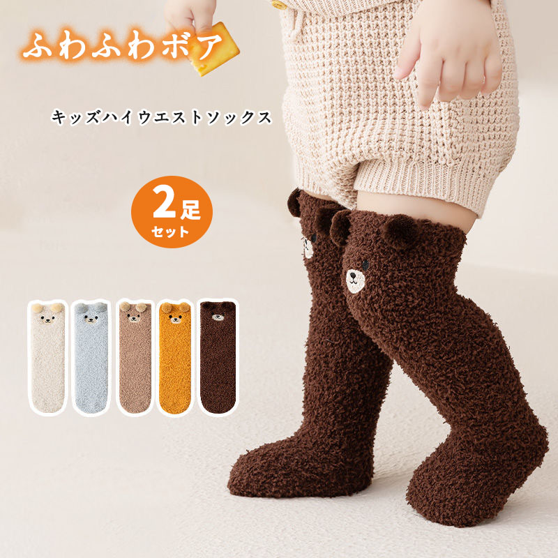 ボア 靴下 ベビー 冬 ハイソックス もこもこ あったか 2足セット キッズソックス 起毛 ソックス 暖か 防寒 厚手 くつ下 膝丈 男の子 女の子 ベビーソッ くまちゃん