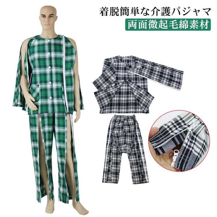 レディース 紳士 チェック柄 介護パジャマ ファスナー式 オムツ交換 女性 春秋 秋 婦人 男性 長袖 メンズ 全開 介護 パジャマ 2点セット 入院パジャマ 両開き 介護パンツ 上下 セッ 両脇全開