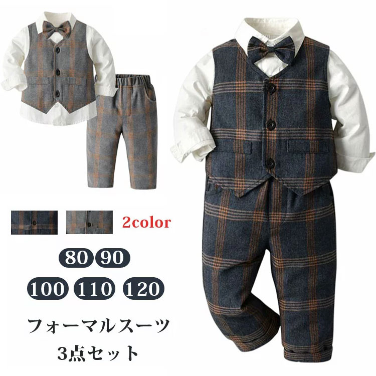 キッズ フォーマル スーツ 男の子 ベスト+シャツ+パンツ 80 90 100 110 120 子供 セットアップ チェック柄 結婚式 長袖 上下セット 七五三 ベビー服 入園式 卒園式 入 おしゃれ