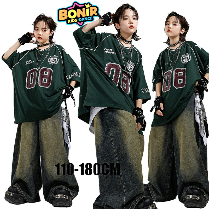 キッズ ダンス 衣装 ストリート系 ヒップホップ ジュニア 男女兼用 ジーンズ バスケ ユニフォーム 上下セット グリーン Vネック 半袖 ナンバープリント ステージ衣装 イベント 個性的 お 発表会