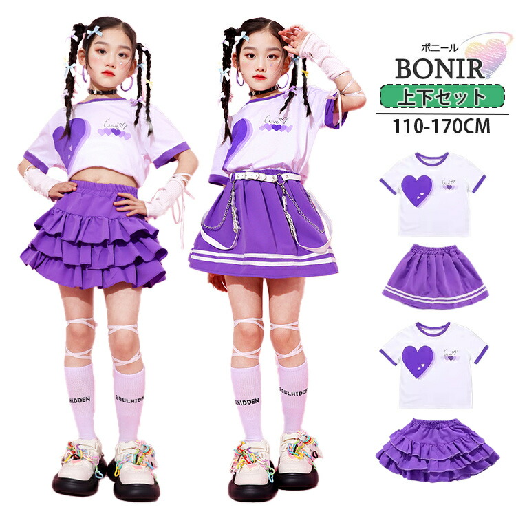 紫 ダンス衣装 キッズ 女の子 ガールズ パープル フリルミニスカート シャツ ハート柄 スカート ダンスウェア 発表会 応援団 イベント ジュニア カッコイイ jazz K-POP オシャレ 普段着