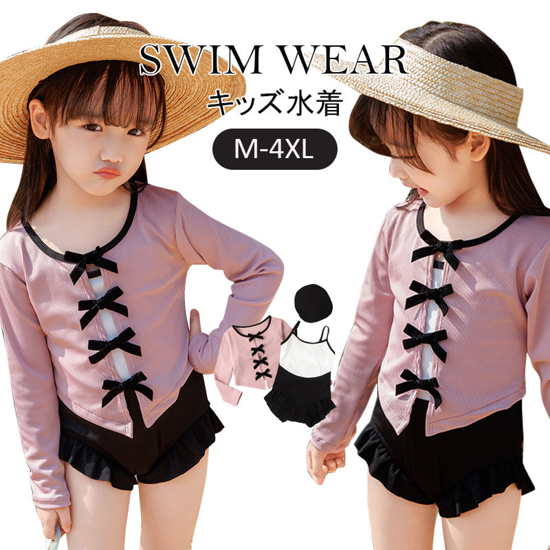 キッズ 水着 女の子 オールインワン 3点セット ラッシュガード付き 長袖 トップス スイムキャップ おしゃれ ベビー ジュニア 90-140cm 海 プール ビーチ リゾート 温泉 フリル 幼稚 夏