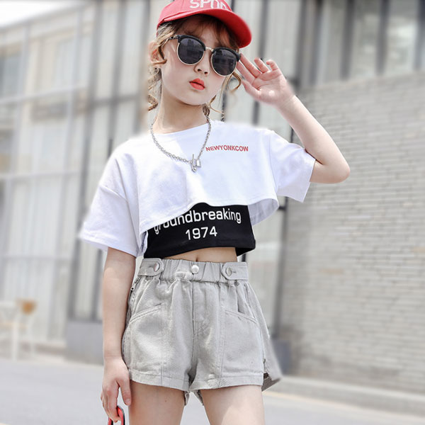 女の子 夏服 トップス ショートシャツ+ベスト お洒落 アルファベット キッズ ガールズ 丸首 半袖 白いシャツ 黒のベスト 切り替え ファッション ダンス衣装 トップス チア へそ出し