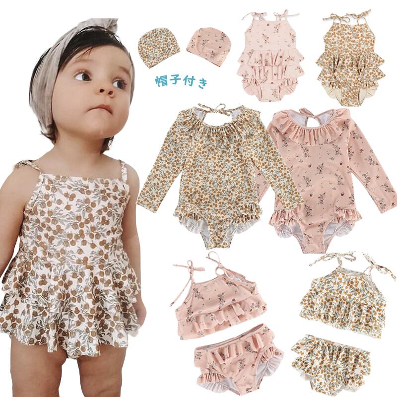 キッズ 水着 女の子 セパレート かわいい ラッシュガード パンツ 3点セット ベビー水着 女児 花柄 フリル スクール水着 子供用 こども みずぎ 赤ちゃん 80 90 110 120 13 100
