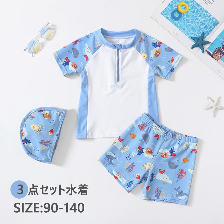3点セット ベビー 水着 男の子 みずぎ 魚柄 半袖 半ズボン 上下セット ラッシュガード セットアップ 幼稚園 小学生 キッズ水着 ジュニア 子供 スクール水着 スイミング プール 水 スイムウェア