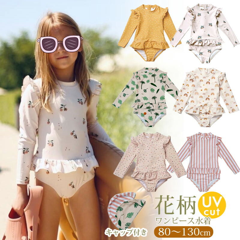 当店一番人気! キャップ付き長袖で紫外線対策もバッチリ!セパレート、オールインワンタイプまで、可愛いデザインが盛りだくさん? お出かけも水遊びもこれ1枚で完結!