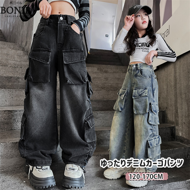ゆったり デニムパンツ キッズ ダンス ダンス衣装 ヒップホップ 女の子 男の子 ブラック ブルー 黒 青 ワイドパンツ カーゴパンツ ジーンズ ストリート ジャッズ 団体服 ダンスウェア ガールズ