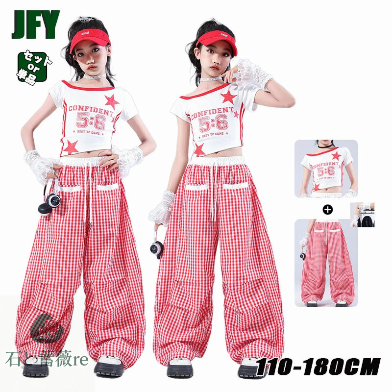 キッズ ダンス 衣装 セットアップ 半袖 tシャツ 白 ショート丈 へそ出し 星 パンツ チェック 柄 赤 ヒップホップ hiphop kpop 韓国 単品 セット レース 子供 子供服 ギャル 手袋