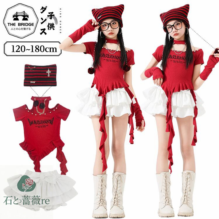キッズ ダンス 衣装 赤 セットアップ 女の子 ヒップホップ レー