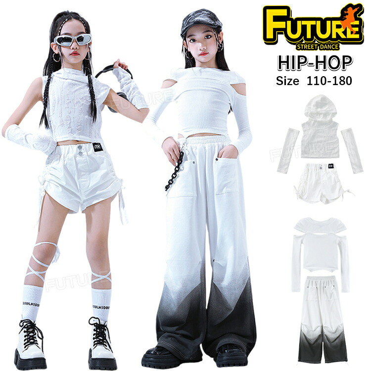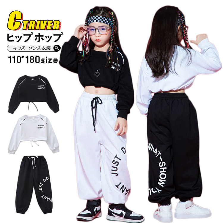 ダンス トップス へそ出し キッズダンス衣装 女の子 ヒップホップ セットアップ 白シャツ 黒 パンツ かっこいい ジャズダンス 韓国 -衣装 子供 イベント 発表会 演出服 110 180