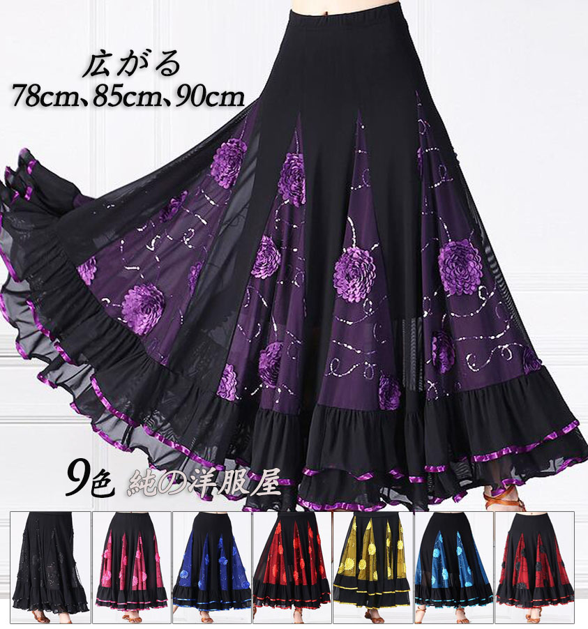 カラフル モダンドレス ダンス用広がるスカート ロング丈 二重フリル裾 スパンコール 立体お花 エレガント 社交ダンス スカート ラテンダンス フラメンコ ダンス衣装