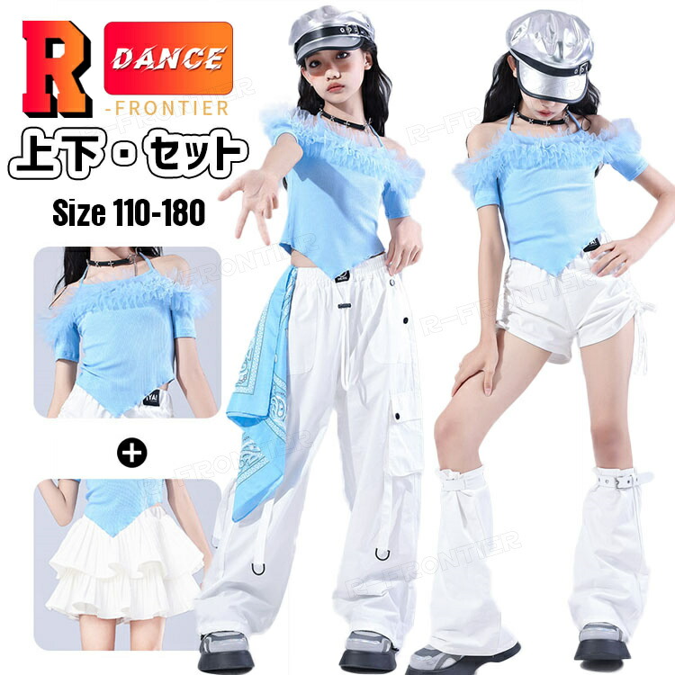 キッズ ダンス 衣装 女の子 セットアップ 青色 へそ出し トップス 白パンツ カーゴパンツ ホワイトスカート 韓国 - セットアップ 演出服 応援団 練習着 110 180