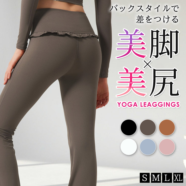 ウエストにさりげないフリルをあしらった大人可愛いヨガフレアレギンス ヨガウェア ヨガウエア ヨガパンツ 女性 フレアパンツ エクササイズ スポーツ 部屋着 ワンマイルウェア シンプル