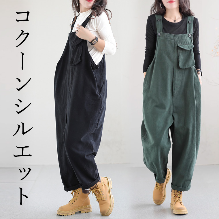 ゆったりサルエル調のお洒落オーバーオール 30代 40代 50代 レディース つなぎ コクーンパンツ ワイドパンツ セミワイドパンツ オールインワン ジャンプスーツ カーキ グリーン ブラック ボタン